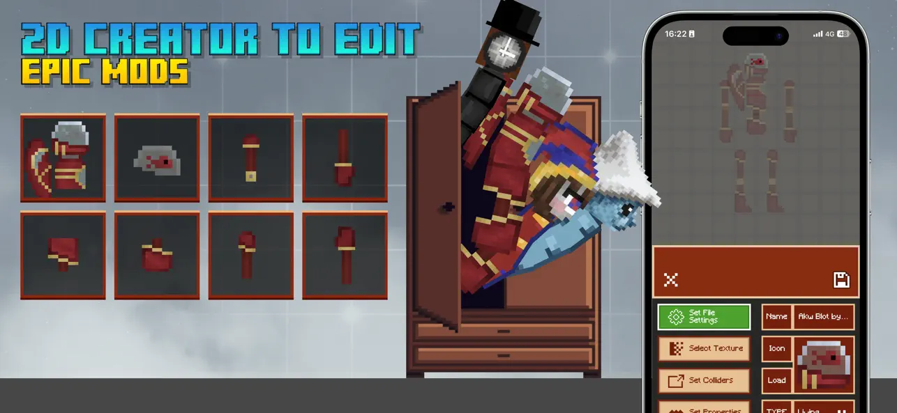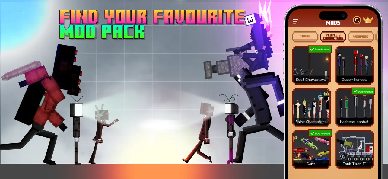 Big room with unlimited freedom of action, experimental physics and an impressive collection of tools, characters and scenery. You can do whatever you want with our wide variety of mods. With our Mods for Melon Playground you can use your creativity to the maximum possibility. Game area give players many choices to create different character incidents between items. No matter where are you on the room you will be a part of a big experiment with car crashes, tanks and weapons, dinosaur appearing, big buildings with tons of furniture. We have collected the most interesting mods on various topics such as: weapons, animal mods, cars mod, furniture, tanks and technics, different buildings and many other. You have possibility to own many unique weapons to take down random obstacles. If you are looking for Melon Playground Mods that challenging and fun you deffinitely try our app !